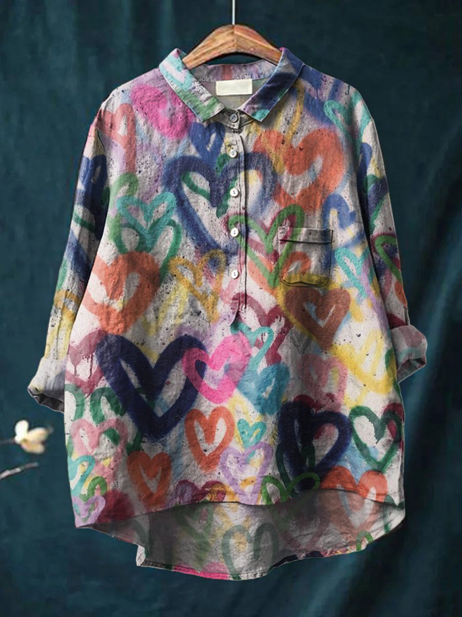 Women's Graffiti Heart Print Print Casual Cotton And Linen Shirt